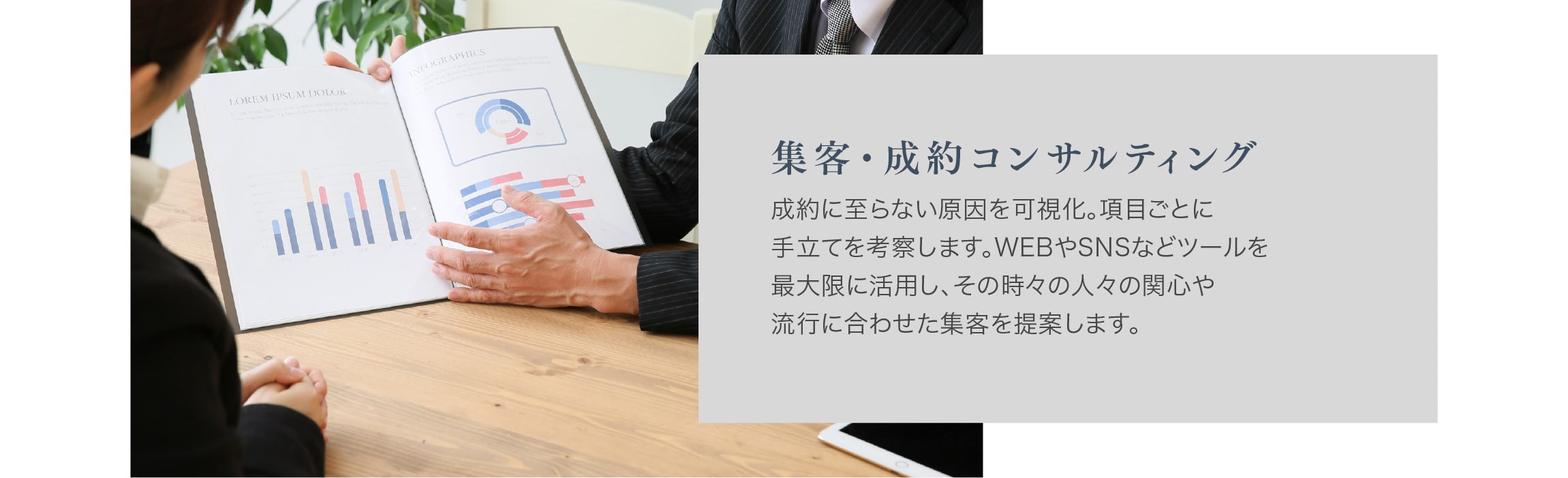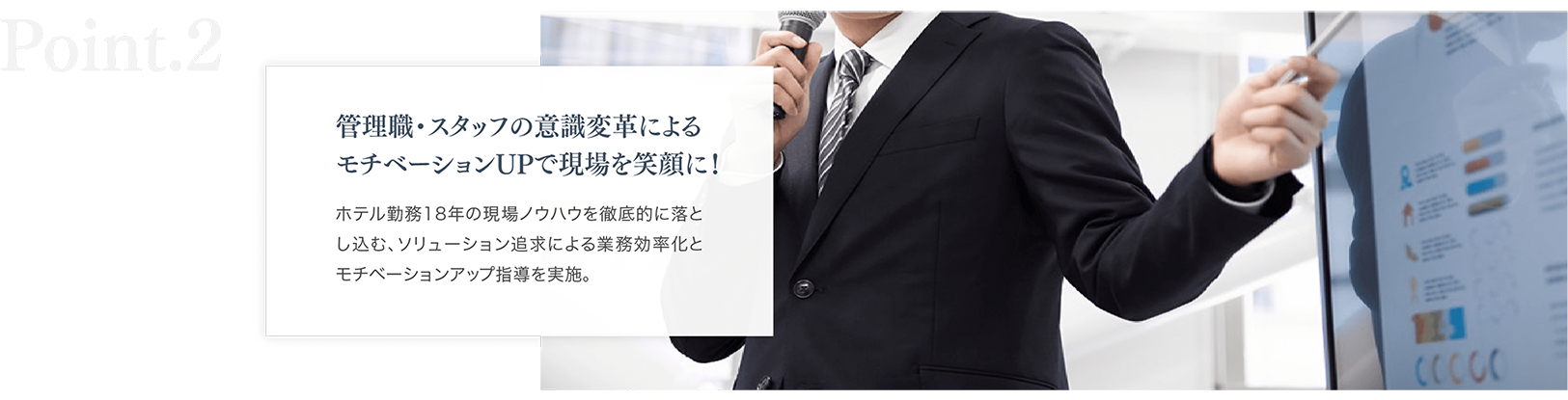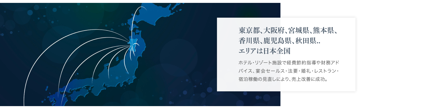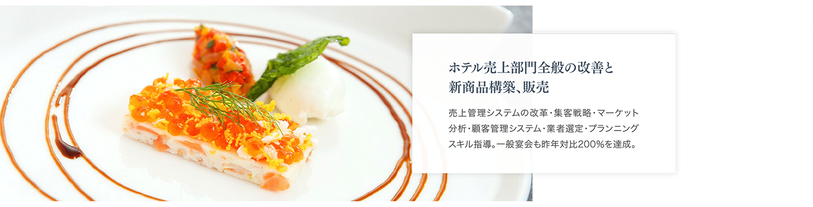 ホテル・リゾート等での宴会、宿泊、法要、婚礼、レストラン事業を総合的な角度からバックアップ。財務状況からのアクション提案、組織マネジメント、スタッフの意識変革、商品・料理企画、業務効率化、生産性アップまで、収益向上と利用者の満足度のためにノウハウを提供します。